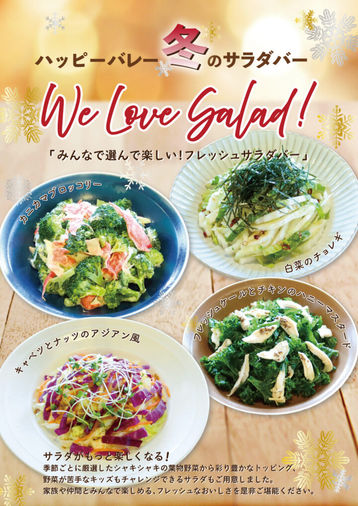 ハッピーバレー冬のサラダバー HAPPY VALLEY | HAPPY Jr. 2025年12月01日 季節ごとに厳選したシャキシャキの葉物野菜から彩り豊かなトッピング、野菜が苦手なキッズもチャレンジできるサラダもご用意しました。 家族や仲間とみんなで楽しめる、フレッシュなおいしさを是非ご堪能ください。